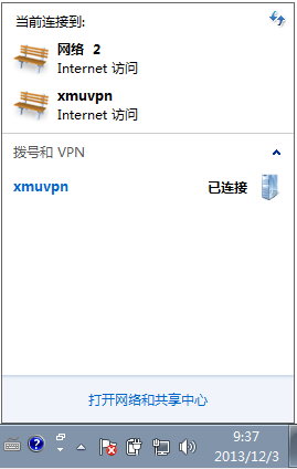 连接成功后,可以在网络连接中看到“xmuvpn”会有“己连接”的状态了,自此Win7下的PPTP VPN连接就设置好了。