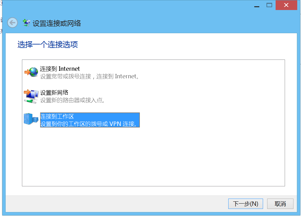 2.点击“设置新的连接或网络”,选择“连接到工作区”,点“下一步”