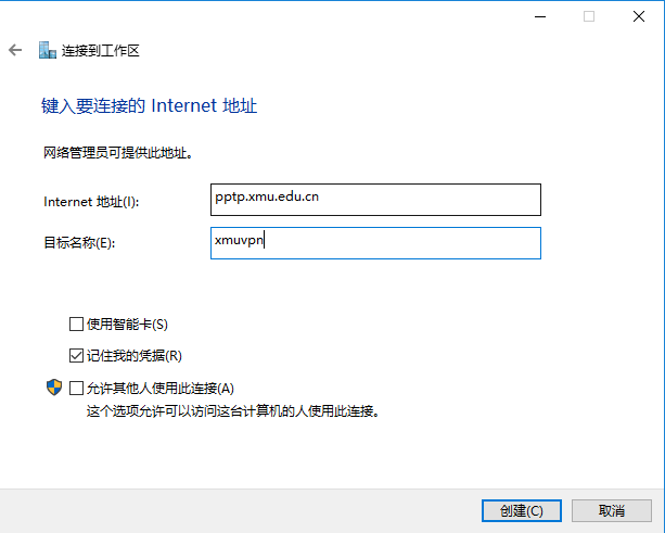 在Internet地址中填入“pptp.xmu.edu.cn”,目标名称可任意填写,如“xmuvpn”,然后点“创建”。
