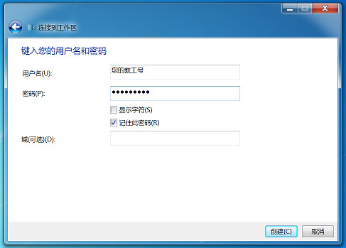 在用户名中填入您的教工号,密码中填入XMUNET+无线网(或ikev2 VPN)的密码,如果您是在自己的电脑上设置VPN的话,记得勾上“记住此密码”,之后点“创建”。