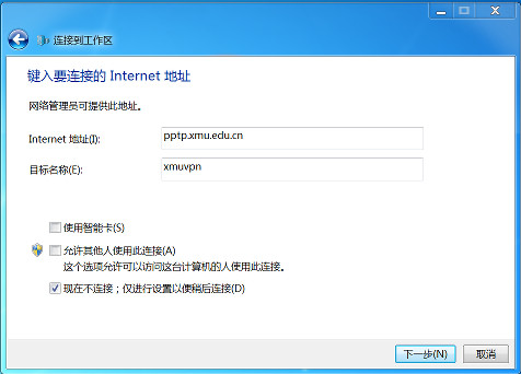 在Internet地址中填入“pptp.xmu.edu.cn”,目标名称可任意填写,如“xmuvpn”,勾选“现在不连接;仅进行设置以便稍后链接”,然后点“下一步”。