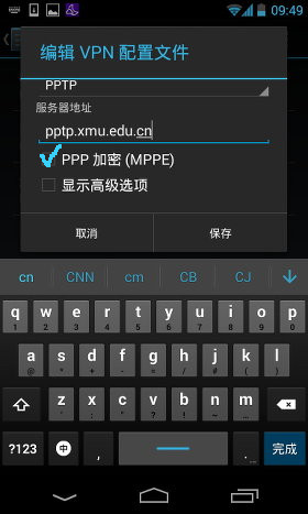 向下拖动以设置VPN的其他选项,“服务器地址”填pptp.xmu.edu.cn;“PPP加密”勾上,然后点击保存。