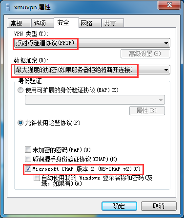 5.选择“xmuvpn”右键“属性”,点击“安全”标签页,“VPN类型”选择“点对点隧道协议(PPTP)”,“数据加密”选择“最大强度的加密(如果服务器拒绝将断开连接)”,“允许使用这些协议”中勾上“Microsoft CHAP版本2(MS-CHAP v2)(C)”,然后点确定。