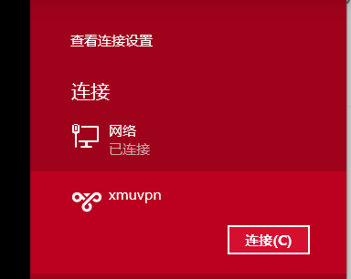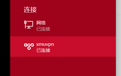 连接成功后,连接中的xmuvpn就会显示“已连接”的状态了,自此Win8下的PPTP就设置并连接上了。