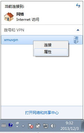 在屏幕右下角单击一下网络连接的图标后,可以看到我们刚刚设置的VPN连接已经出现在“拨号和VPN”列表中了,在它上面点一下右键,再单击一下“属性”。