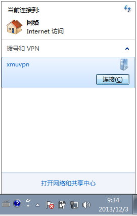 然后从屏幕的右下角点开网络连接,再单击设置好的VPN连接(这里是“xmuvpn”),然后点击“连接”。