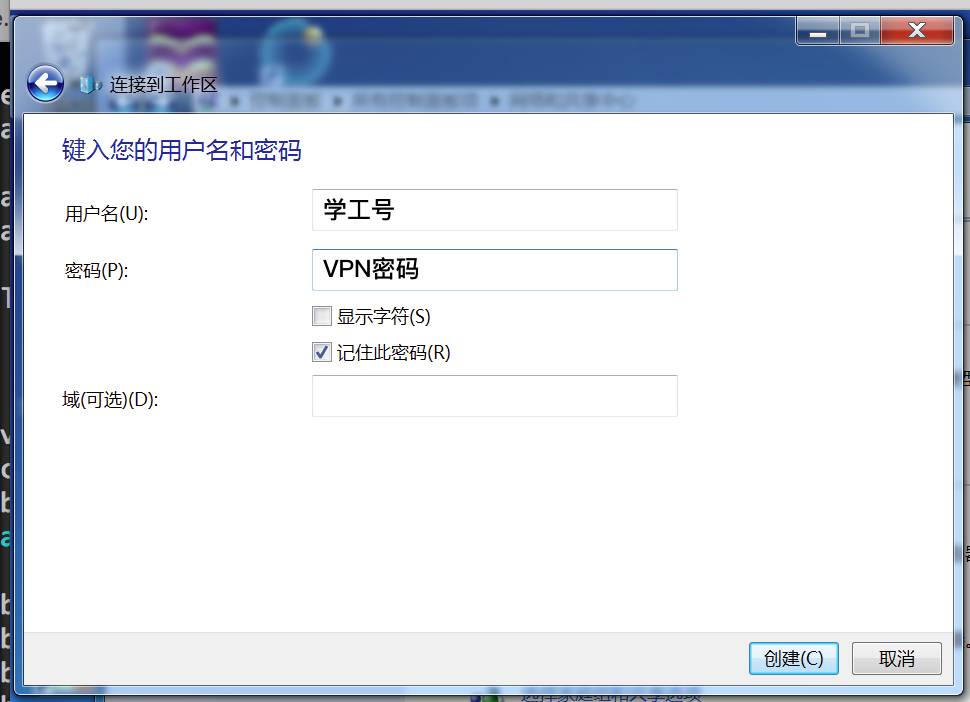 第七步,填入你的用户名(学号或教工号)和密码(你此前设置好的WiFi密码);选择“创建”;