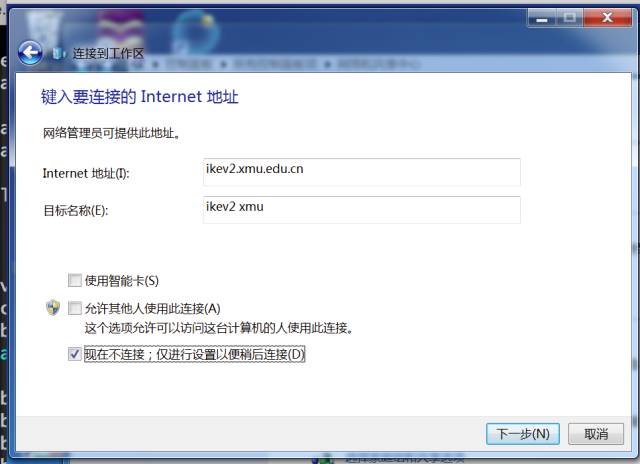 第六步,很关键!输入正确的服务器网址:ikev2.xmu.edu.cn,“目标名称”自己随便取,方便识别即可;同时请勾选“现在不连接;仅进行设置……”;下一步;