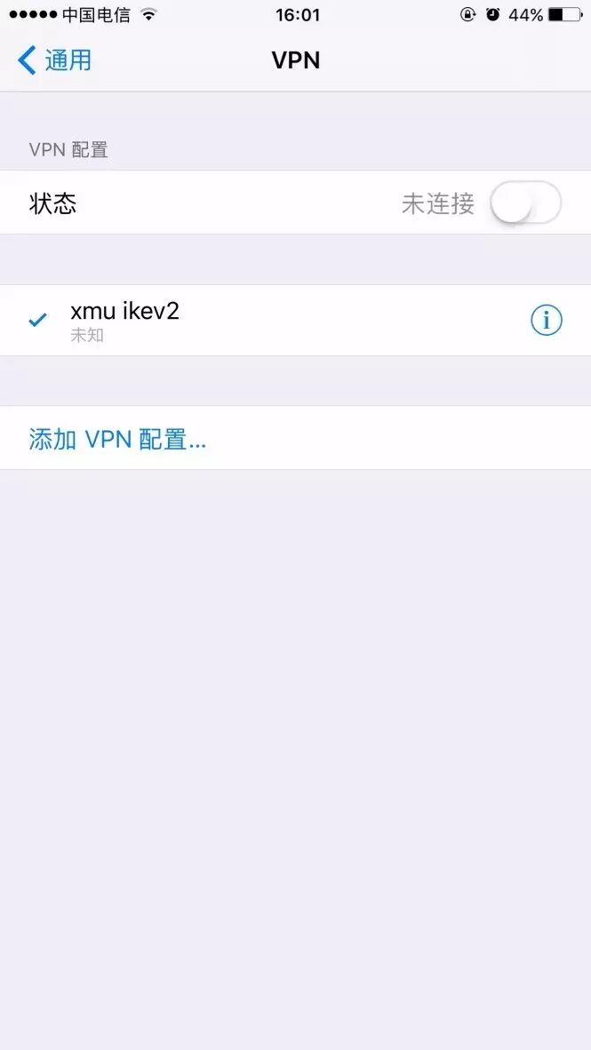 这是连接好的界面。左上角运营商信息的旁边会多出一个蠢萌的VPN标志。恭喜!你可以随时访问学校图书馆丰富的网络资源了。