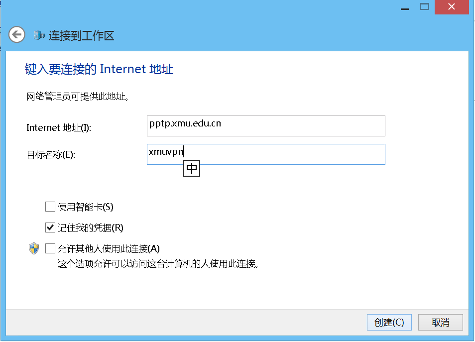 在Internet地址中填入“pptp.xmu.edu.cn”,目标名称可任意填写,如“xmuvpn”,然后点“创建”。