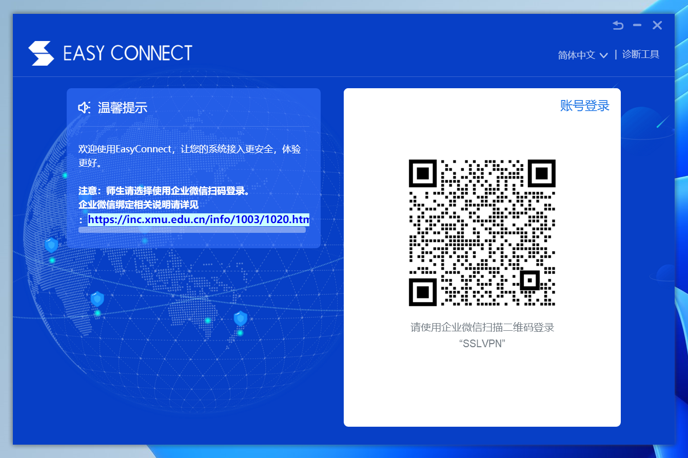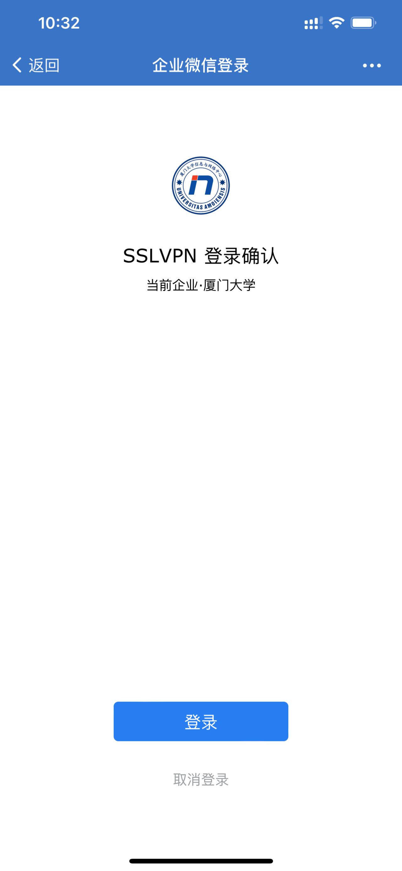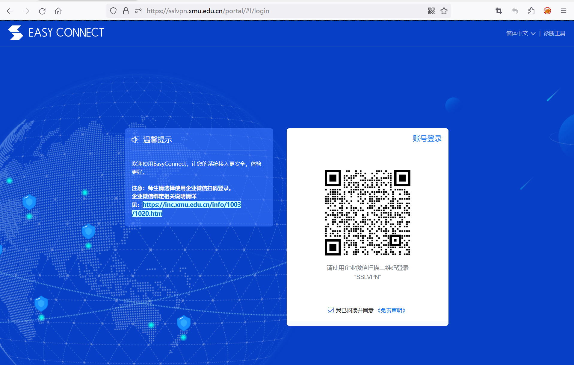 登录SSL VPN只需要用浏览器访问 https://sslvpn.xmu.edu.cn ,然后用手机上的企业微信扫码登录。