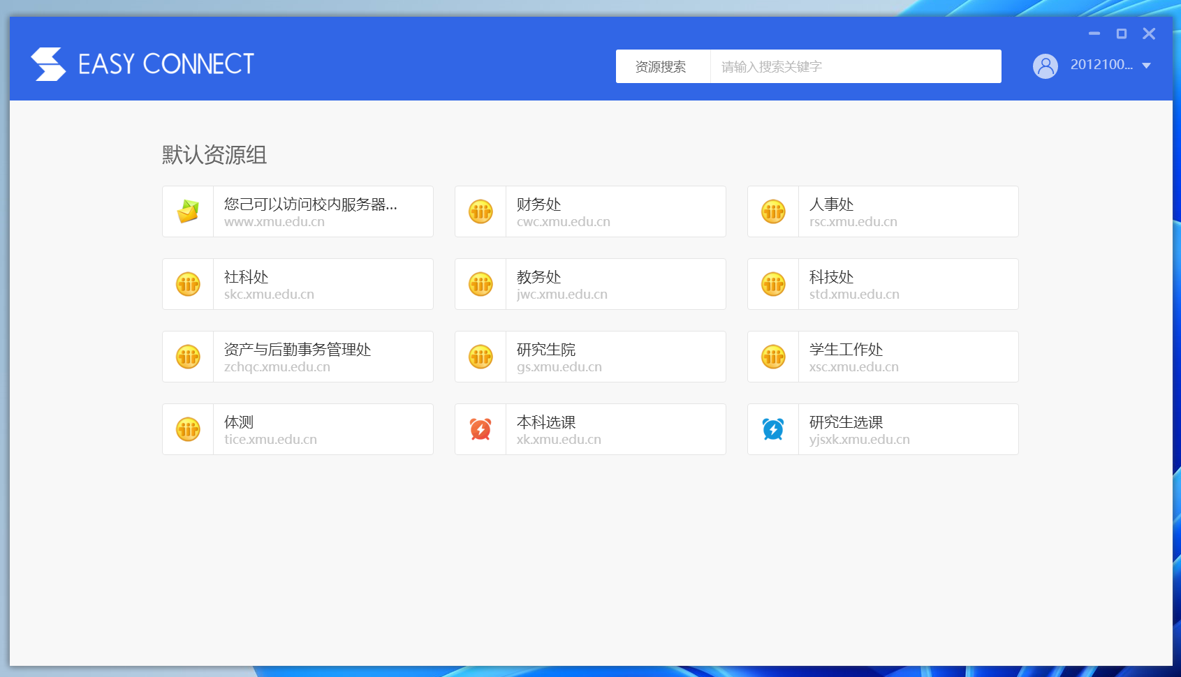 完成工作后请从EasyConnect程序或浏览器https://sslvpn.xmu.edu.cn页面的右上角点击“注销登录”退出,以还原电脑的网络配置。