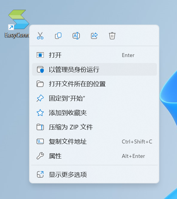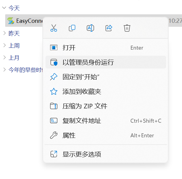 客户端为EasyConnect,安装前确保360安全助手等安全软件先完全退出,以防注册表保护导致安装不完整。安装时,先在安装程序上点右键,选择以管理员身份运行: