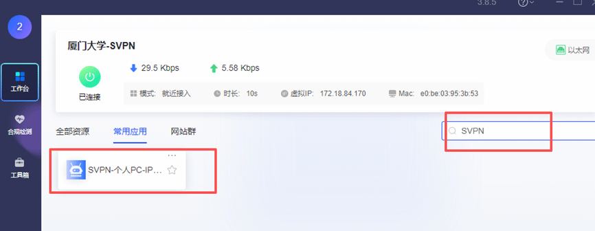 2. 在客户端的资源列表中搜索“SVPN”关键字,点击如下应用,进行个人PC绑定。